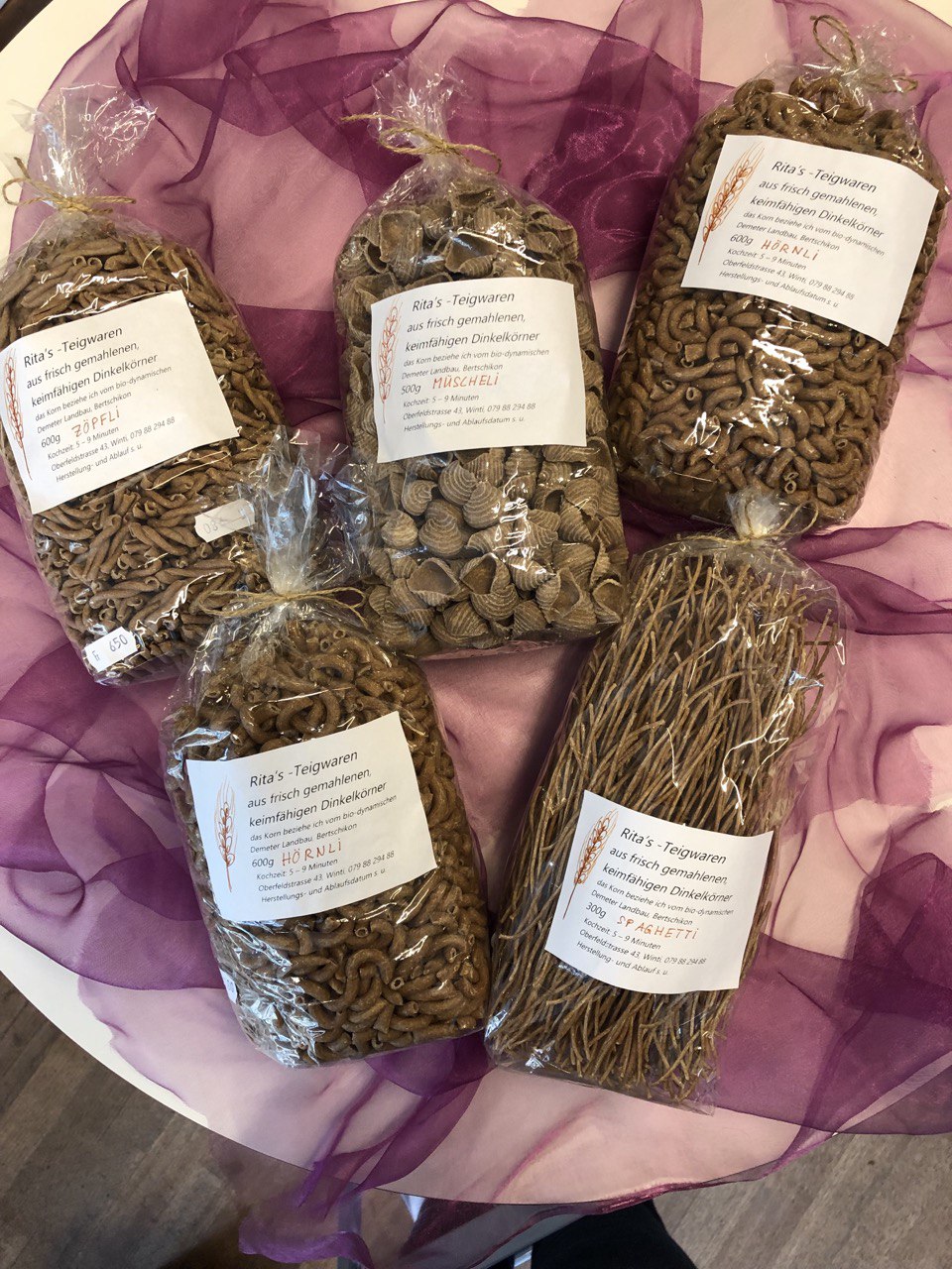 Die besten Dinkelteigwaren – aus Mehl, gemahlen aus dem vollen Korn, selbst der Keimling ist noch vorhanden. Der Dinkel wird in Bertschikon in Demeterqualität angebaut und von Rita in Winterthur liebevoll verarbeitet. Ein gesunder und regionaler Genuss.